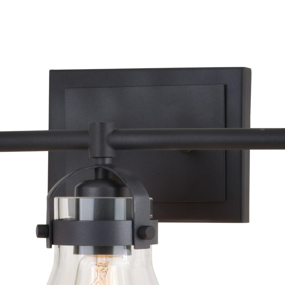 A nod to farmhouse and industrial aesthetics are realized in the Mason vanity collection. Charcoal black accents offer a striking contrast to each funnel shaped shade. As they sit perched along a horizontal support, a brilliant show of light pours from each shade, creating a bright shine on the subject below. This 3-light vanity is ideal in any bath, or interior space where extra light is welcomed.