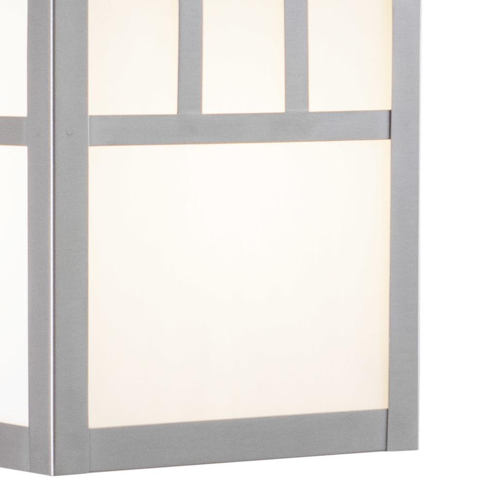 Flat strips of stainless steel outline white tiffany style glass panes in the Mission collection. The simple design of this fixture has a mission style look perfect for Frank Lloyd Wright prairie inspired decors. This outdoor wall light is ideal for your porch, entryway, garage, or any other area of your home.