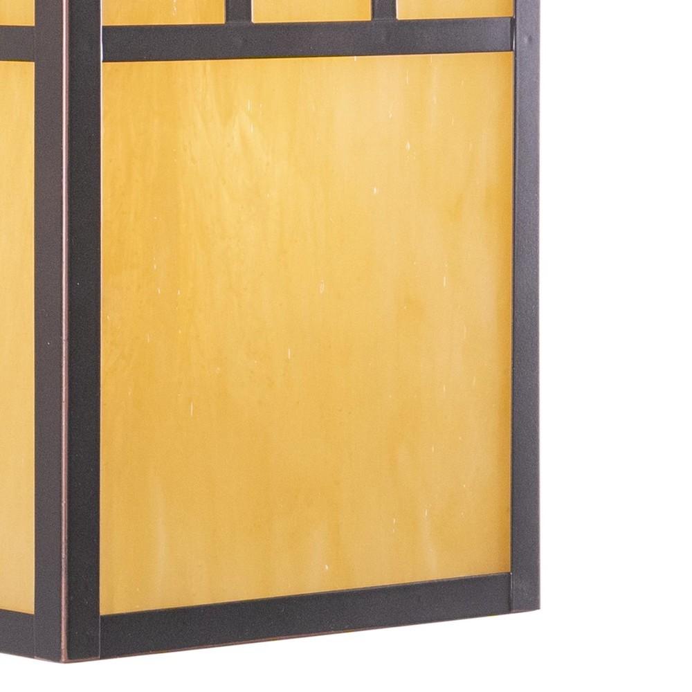 Flat strips of burnished bronze outline honey opal glass panes in the Mission collection. The simple design of this fixture has a mission style look perfect for Frank Lloyd Wright prairie inspired decors. This outdoor wall light is ideal for your porch, entryway, garage, or any other area of your home.