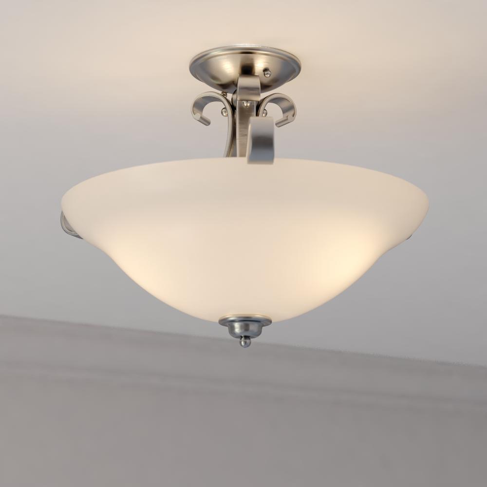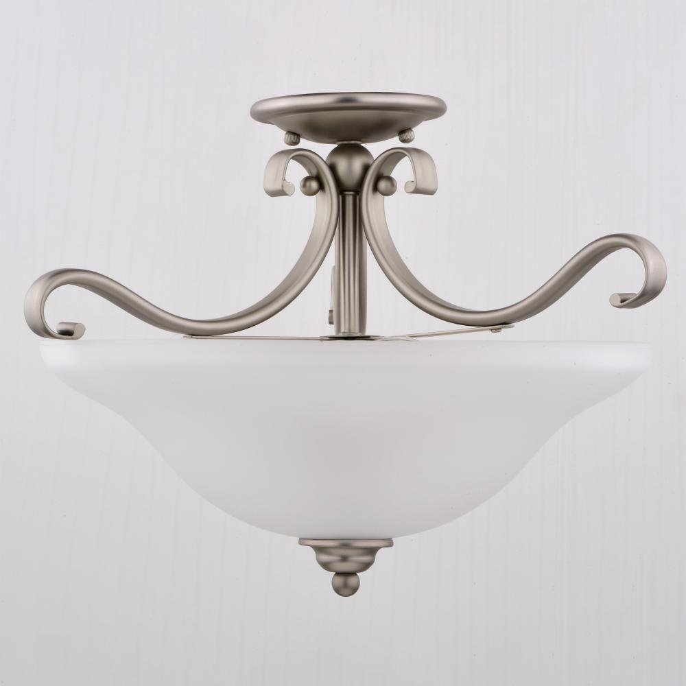 The soft traditional lines of the Monrovia collection allow you to combine styles within your home without compromising on design. The brushed nickel and frosted white glass add a certain level of sophistication and elegance that is rare to achieve. Update your look with a hint of class. This fixture is part of a collection with coordinating pieces to decorate any room in the house. This versatile fixture can be installed two ways; mount as a semi-flush mount ceiling fixture or use the chain to mount as a pendant.