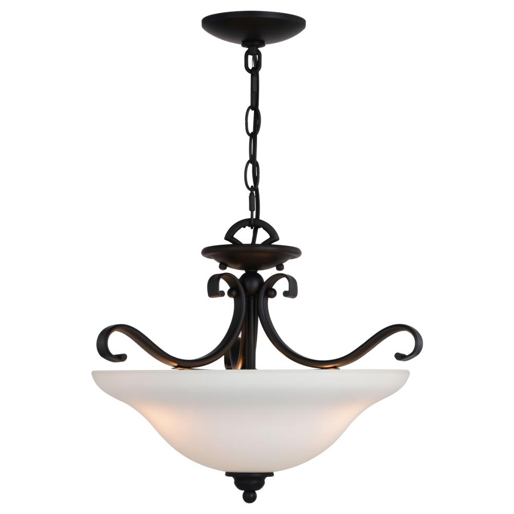 The soft traditional lines of the Monrovia collection allow you to combine styles within your home without compromising on design. The oil rubbed bronze and etched white glass add a certain level of sophistication and elegance that is rare to achieve. Update your look with a hint of class. This fixture is part of a collection with coordinating pieces to decorate any room in the house. This versatile fixture can be installed two ways; mount as a semi-flush mount ceiling fixture or use the chain to mount as a pendant.