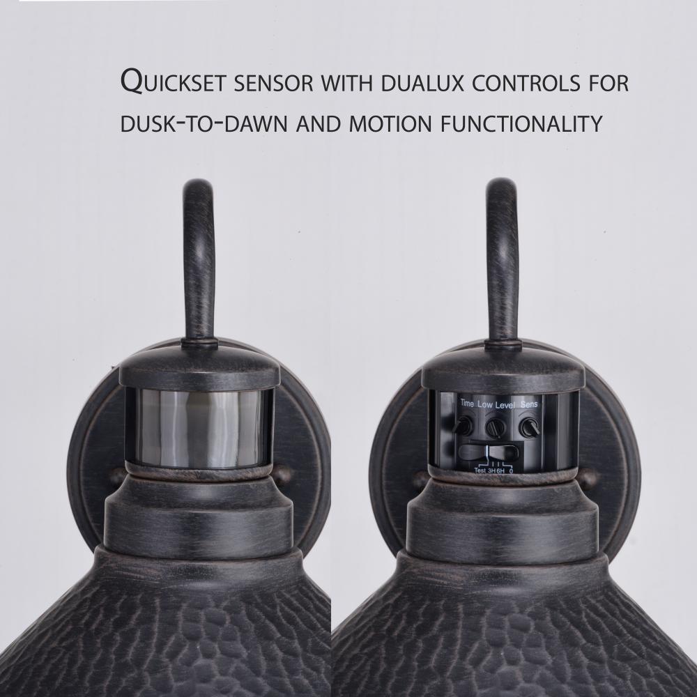 Designed with stately, yet rustic sophistication, the Outland collection is a solid choice for your outdoor space. The finish gives this barn light a warm and inviting elegance, and the finish inside the shade adds to the charm. This outdoor wall light is ideal for your covered porch, entryway, garage, or any other area of your home. Dualux patented dual-level security lighting is outdoor lighting made smarter - brighter light at dusk, dimmer at night, brightening instantly when it detects motion. Designed to reliably and effortlessly enhance your home's beauty, security and efficiency from dusk to dawn with its built-in motion sensor and photocell. This fixture works with any dimmable incandescent or halogen bulb and most dimmable LED bulb models. This decorative outdoor security light is designed to enhance the beauty, safety, and efficiency of your home.