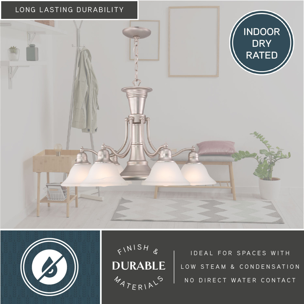 A simple yet sophisticated design is fitting in the traditionally styled Standford collection. It features a brushed nickel finish with white alabaster glass shades. Create a distinguished yet classic look by combining pieces from this extensive series of fixtures. The central column contains an additional bulb controlled separately by an integrated 3-way switch allowing for task down lighting when you need it. This chandelier is ideal for kitchens, dining areas, and foyers.