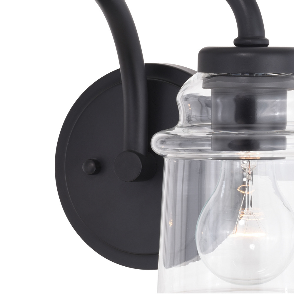 Clean retro lines define this beautiful collection called Toledo. Notes of industrial and farmhouse tradition are defined with the elegance of clear blown glass. Combine that with a vintage Edison style filament bulb to complete the look. Versatile reversible mounting option lets you install this fixture up or down. This bathroom light is perfect over small vanities or as a pair over double sinks.
