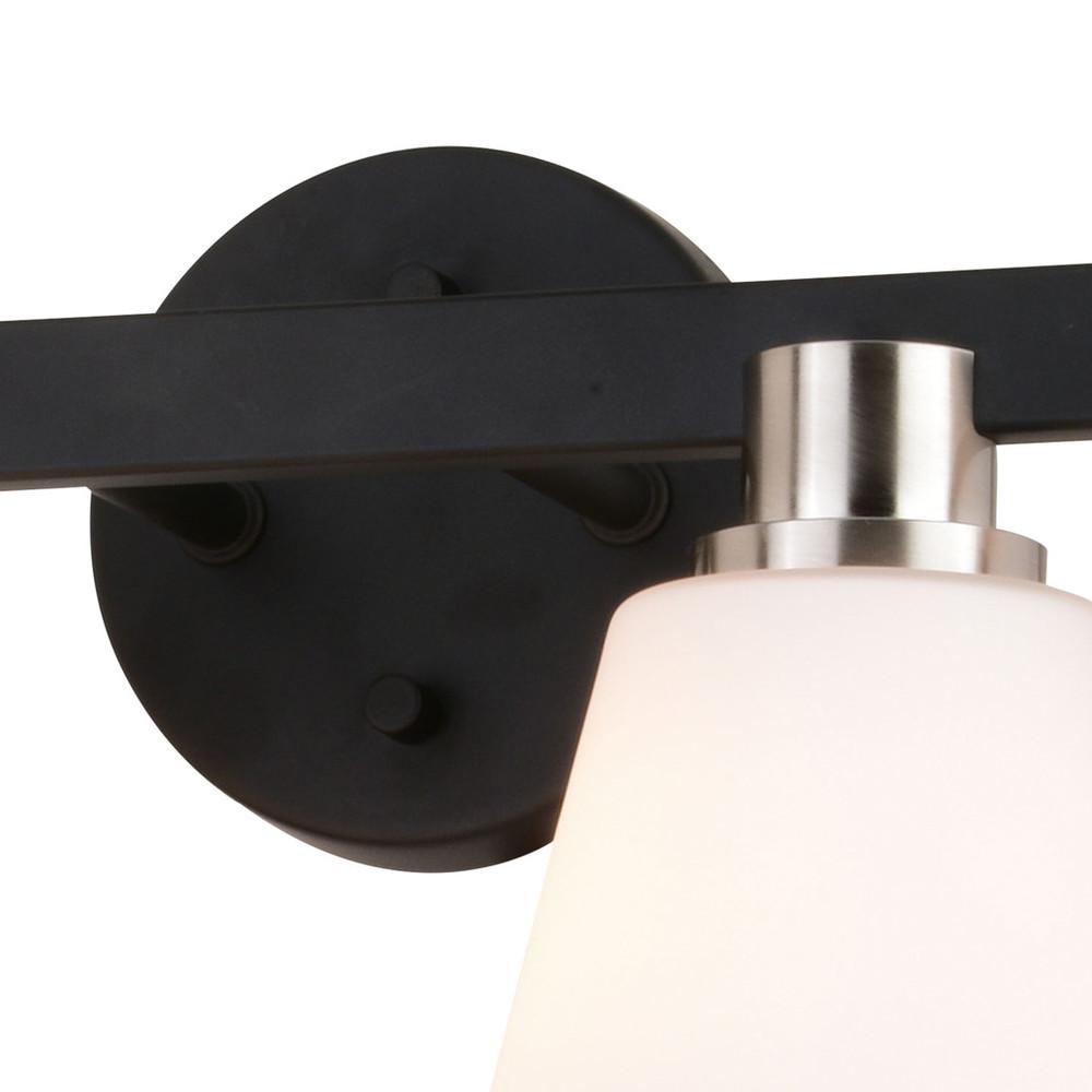 Elegance is exemplified in this collection called Vermont. A simple line of matte black metal acts as a striking backdrop to the etched white glass shades. These generously sized shapes are met with a hint of satin nickel for just the right amount of sheen. Add this understated, but beautiful example of elegance to any trendy bath or other areas of your home.