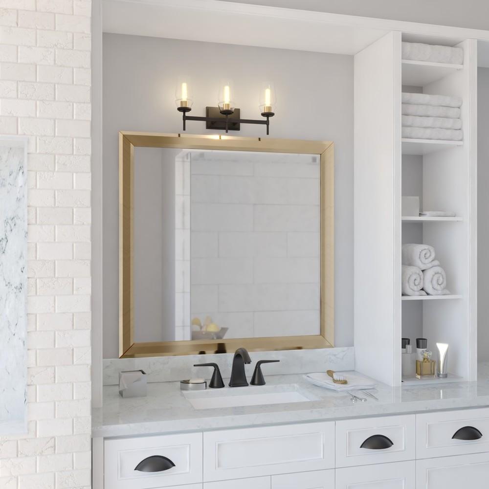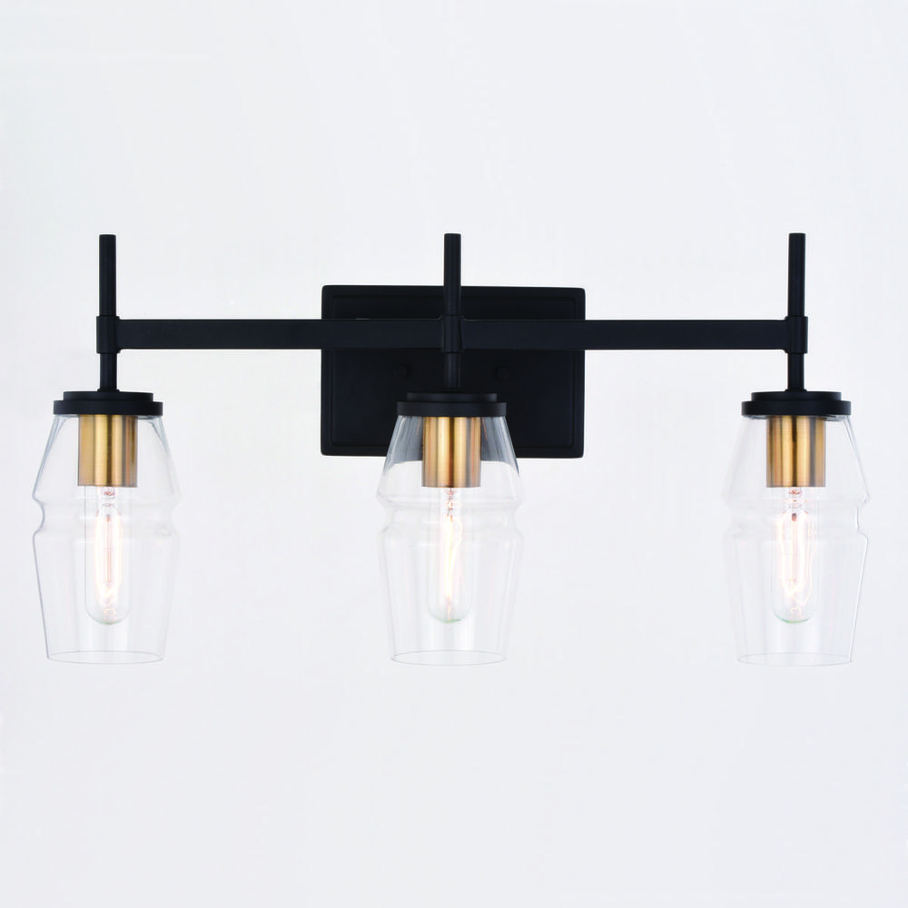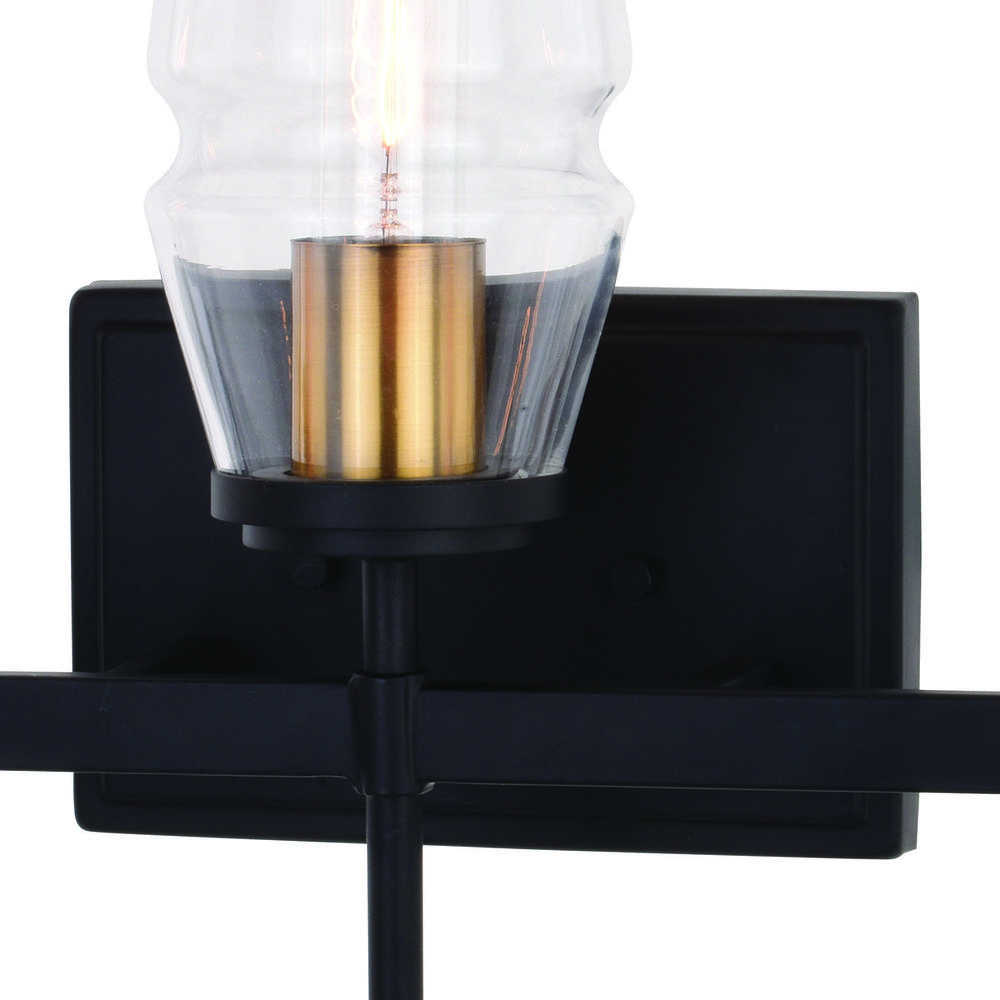 A throwback to mid century modern decor is perfectly represented in the Warren collection. Slightly tapered clear glass shades are evenly spaced along a sleek metal bar. Vertical supports in matte black gives this collection its charm. Memories of years gone by are brought back to life with the brushed brass accents of the Warren collection. Add this vanity wall light to any bath for an on-trend update.