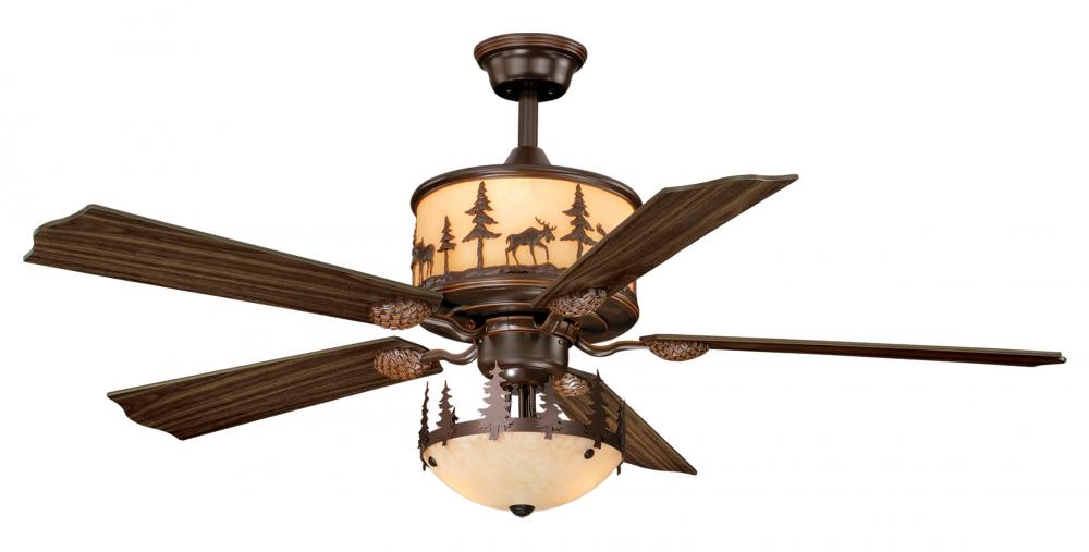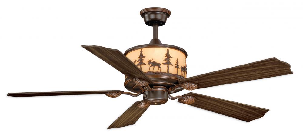 Evoking the spirit of the wilderness, this rustic themed ceiling fan is clad in a burnished bronze finish and features silhouetted moose imagery atop glowing amber flake glass. It a great choice for a vacation lodge, cabin or a suburban home - it will complement a variety of home styles: anywhere you want to bring an element of nature. Add a light kit (sold separately) to brighten up your space. This fan is compatible with sloped ceilings and includes a 6 inch down rod (longer down rods sold separately). Remote control included for added convenience. Blades are reversible; choose between rosewood and dark walnut. Unique lighted motor housing with energy saving LED bulbs (included).