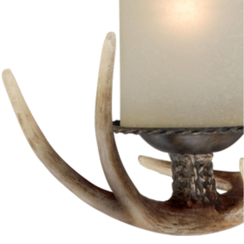 Evoking the spirit of the wilderness, this rustic themed light is clad in a black walnut finish and features crème cognac glass. It will complement a variety of home styles bringing an element of nature indoors. The Yoho collection features reproduction deer antlers making it a great choice for a vacation lodge, cabin or suburban homes. This wall sconce is ideal for bathrooms, hallways, stairways, and foyers.