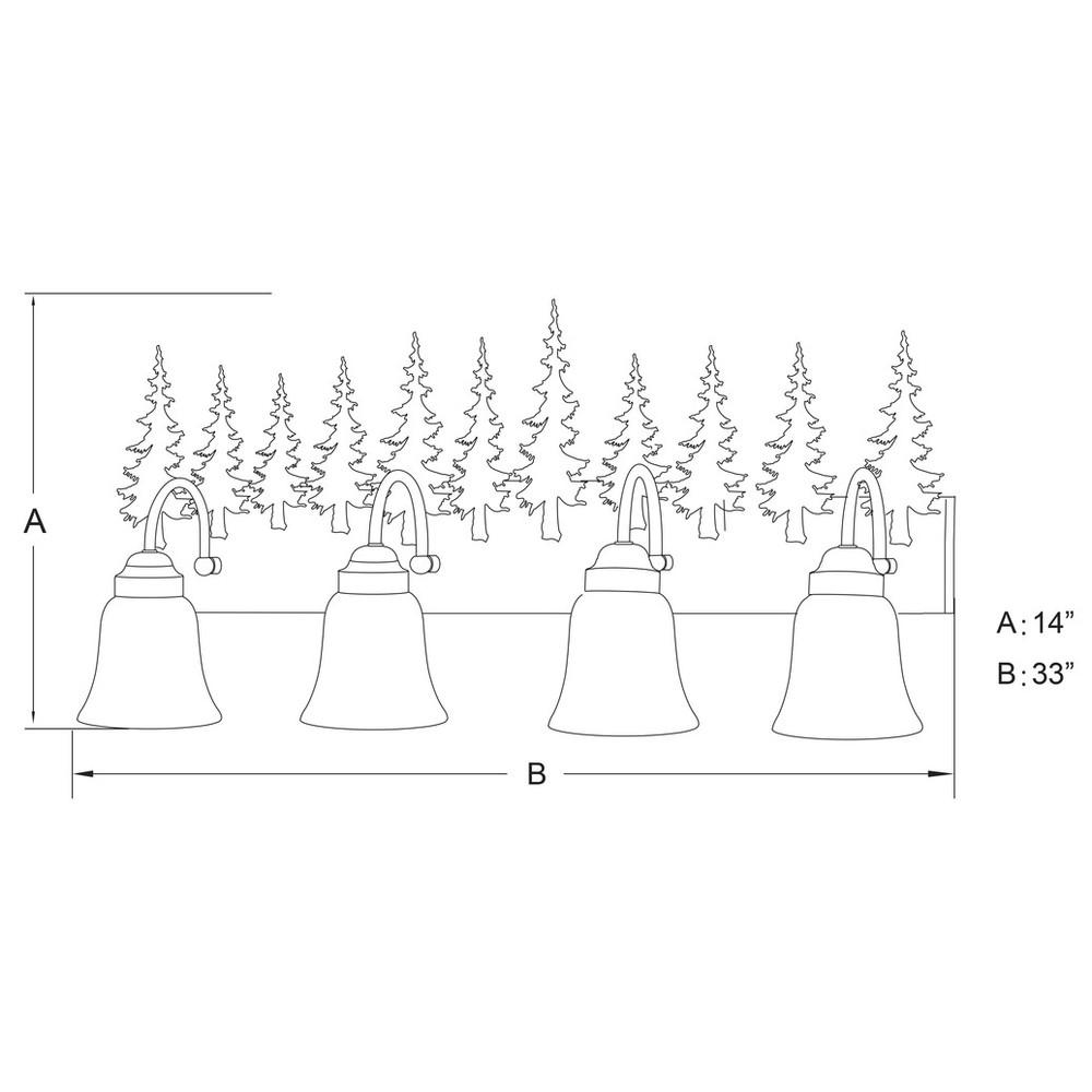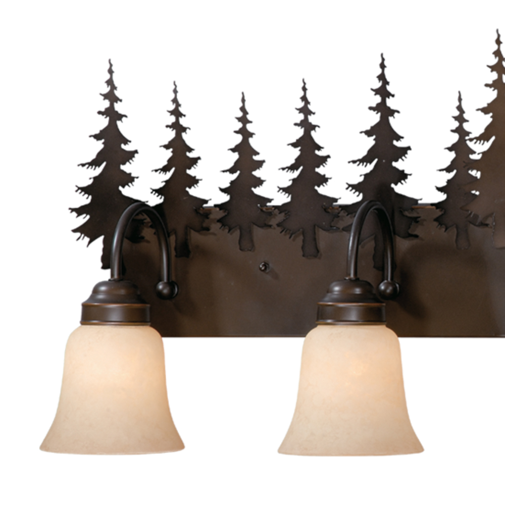 Evoking the spirit of the wilderness, this rustic themed light is clad in a burnished bronze finish and features silhouetted tree imagery atop glowing amber flake glass. It is a great choice for a vacation lodge, cabin or suburban home and will complement a variety of home styles: anywhere you want to bring an element of nature. This bathroom light is perfect over large or double vanities where there is only one outlet box.
