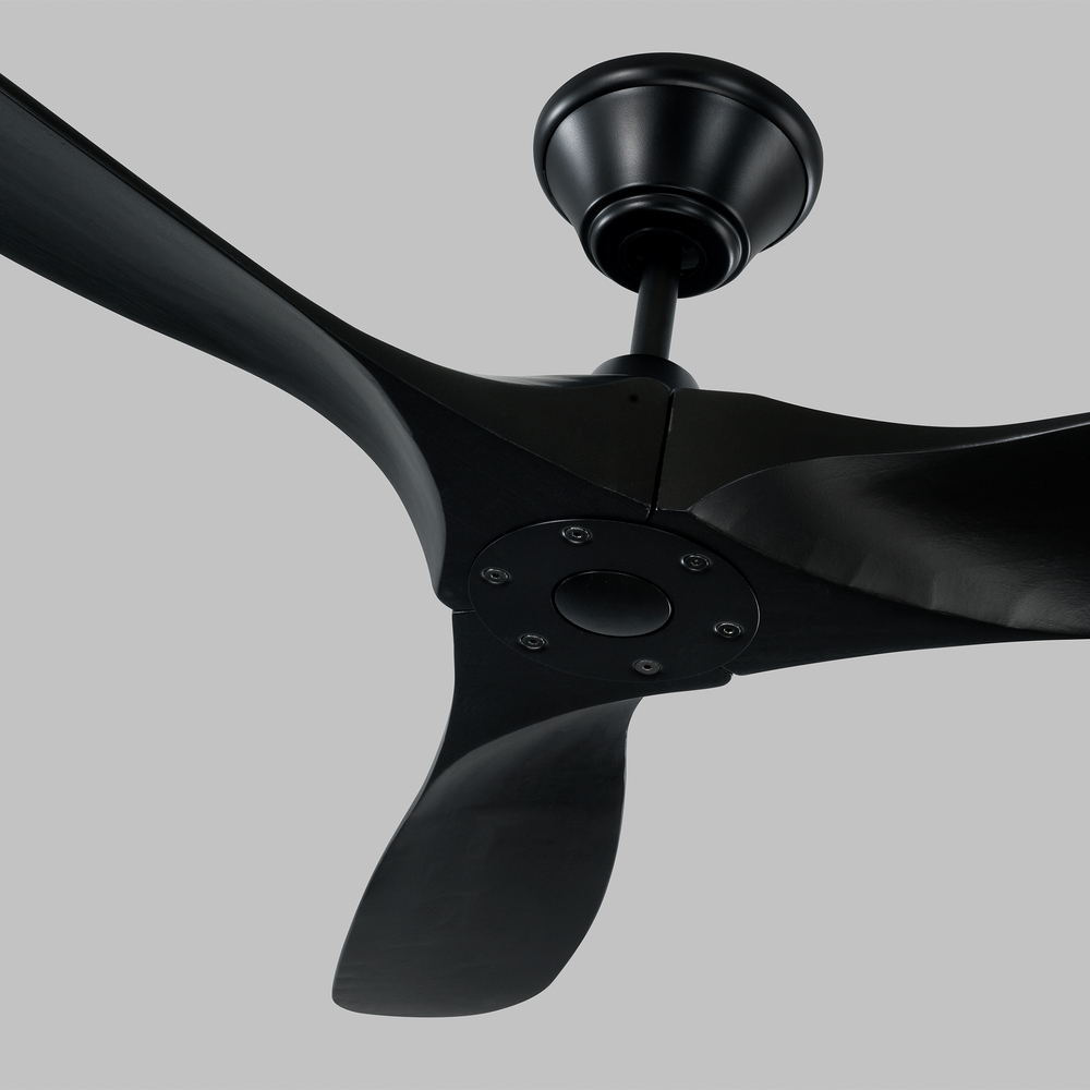 The Maverick 52 in Matte Black w Matte Black Blades features an 85.0 X 28.0 6-speed motor with a Thirteen-degree blade pitch. With a sleek modern silhouette, a DC motor, and super energy-efficiency, the 52" Maverick II ceiling fan features softly rounded blades and elegantly simple housing. Maverick has a 52-inch blade sweep and a 3-blade design that delivers a distinct profile and incredible airflow for living rooms, great rooms, or outdoor covered areas. It includes a hand-held remote with six speeds. It reverses and is available in six distinct finish options: Brushed Steel housing with Dark Walnut blades, Brushed Steel housing with Koa blades, Matte Black housing with Dark Walnut Blades, Aged Pewter housing with Light Grey Weathered Oak blades, Matte Black housing with Matte Black blades and Matte White housing with Matte White blades. All versions feature beautiful hand-carved balsa wood blades. ENERGY STAR qualified. Maverick fans are damp-rated and may be used indoors and in covered outdoor spaces.