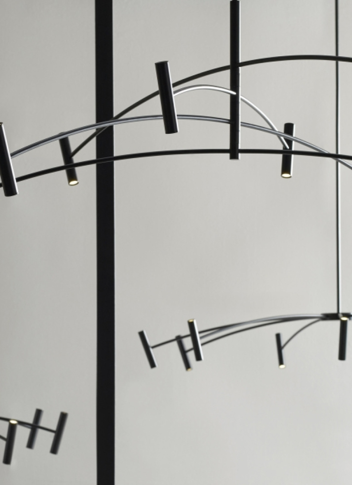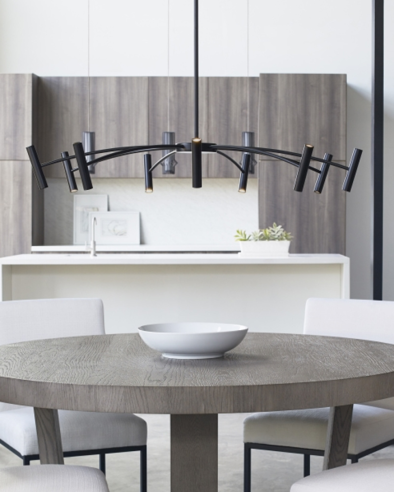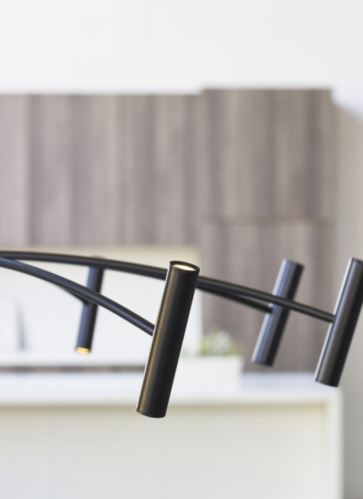 This Aerial chandelier by Sean Lavin for Visual Comfort Modern features symmetrically spaced arched rods supporting a ring of slim cylindrical heads. The cylinders produce up and down illumination while concealing the integrated LED light sources. Offered in Matte Black. A great piece to coordinate with the smaller scale Aerial chandelier in your open living space, dining area and foyer. Lamping options are compatible with most dimmers. Refer to the Dimming Chart for more information.